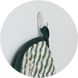 2. Staying in the kitchen, follow package instructions to attach another clear small hook on the cabinet near the stove to hang oven mitts. This way, you’ll never have to search for your oven mitts when baking cupcakes, crème brulee or even frozen pizza.